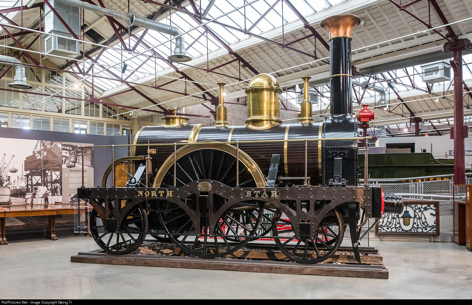 | 2-2-2 or ""1A1" broad gauge (7 ft 1/4 inch or 2140 mm) steamlocomotive "North Star", built in 1838 by Robert Stephenson for the Great Western Railway of Isambard Kingdom Brunel. 12 of this type with 7 ft driving wheel diameter were built from 1838 to 1841, but all withdrawn and (partly) scrapped til 1871. This is a non-working replica built in 1923 with using some parts of the original locomotive and exhibited in the STEAM Museum of the Great Western Railway in Swindon. |