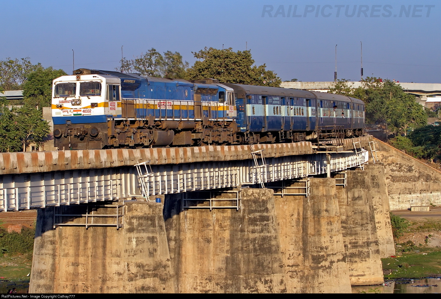 | 11464 Jabalpur - Somnath is now crawling speed as she pull into Rajkot Junction on Aji River bridge in gorgeous evening light. Note the additional safety features of IR... besides the platform, one can simply use ladder to climb down at each pillar to avoid the on coming train. |