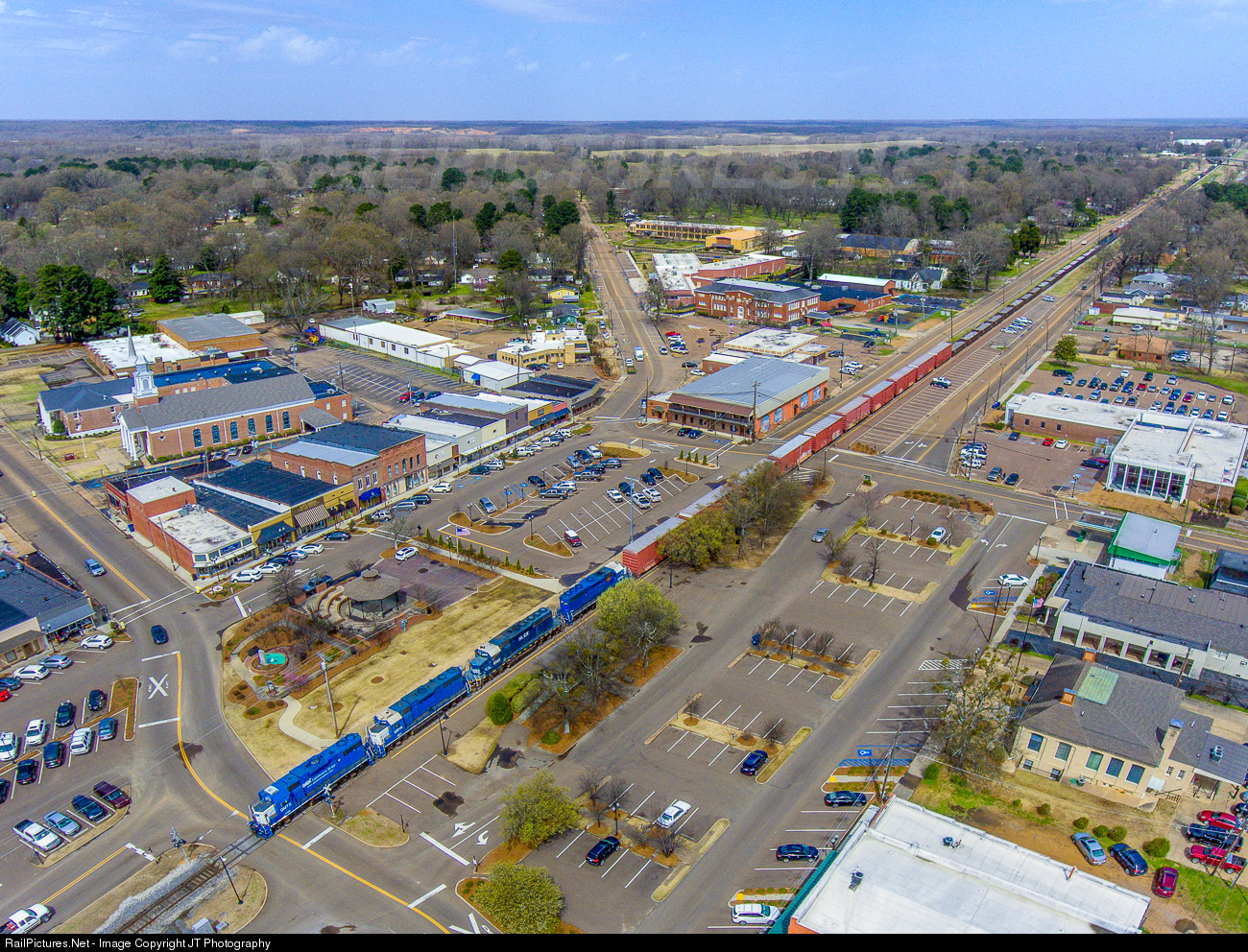 | A southbound Grenada Railroad manifest temporarily divides the small town of Batesville, Mississippi in half as it heads for Grenada. Here in Batesville it will meet a northbound freight bound for Memphis. |
