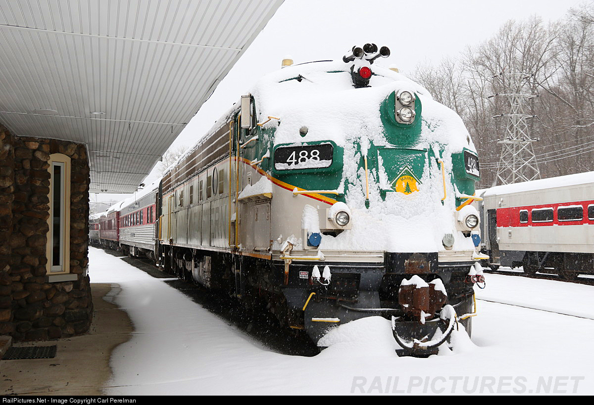 Snowbound Maine Eastern FL9 488 is parked in front of the Whippany station.