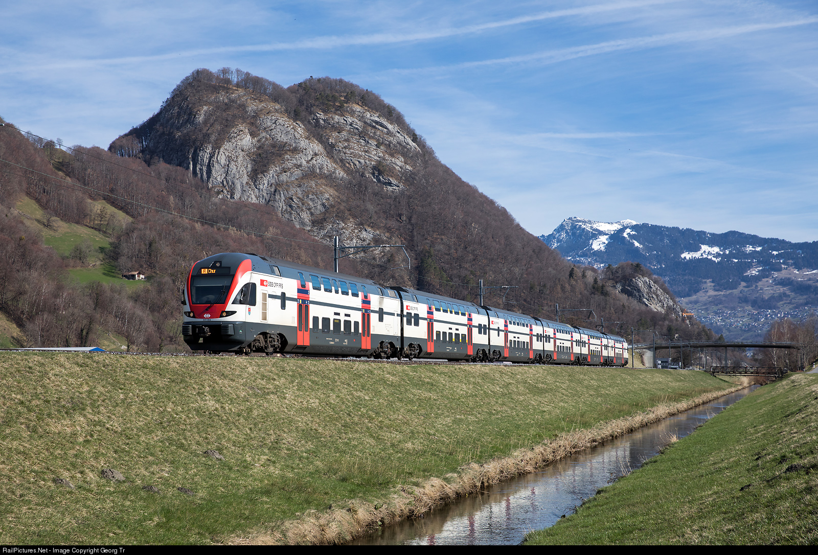 | Doubledeck train RABe 511 # 014 of the SBB, built by Stadler Rail, is running the Interregio 3259 of the line IR13 from Zürich via Winterthur-St.Gallen-Rorschach-St.Margrethen-Sargans to Chur, between Trübbach and Sargans. In the background is Maziferkopf mountain, colloquially better known as "butt mountain"... |