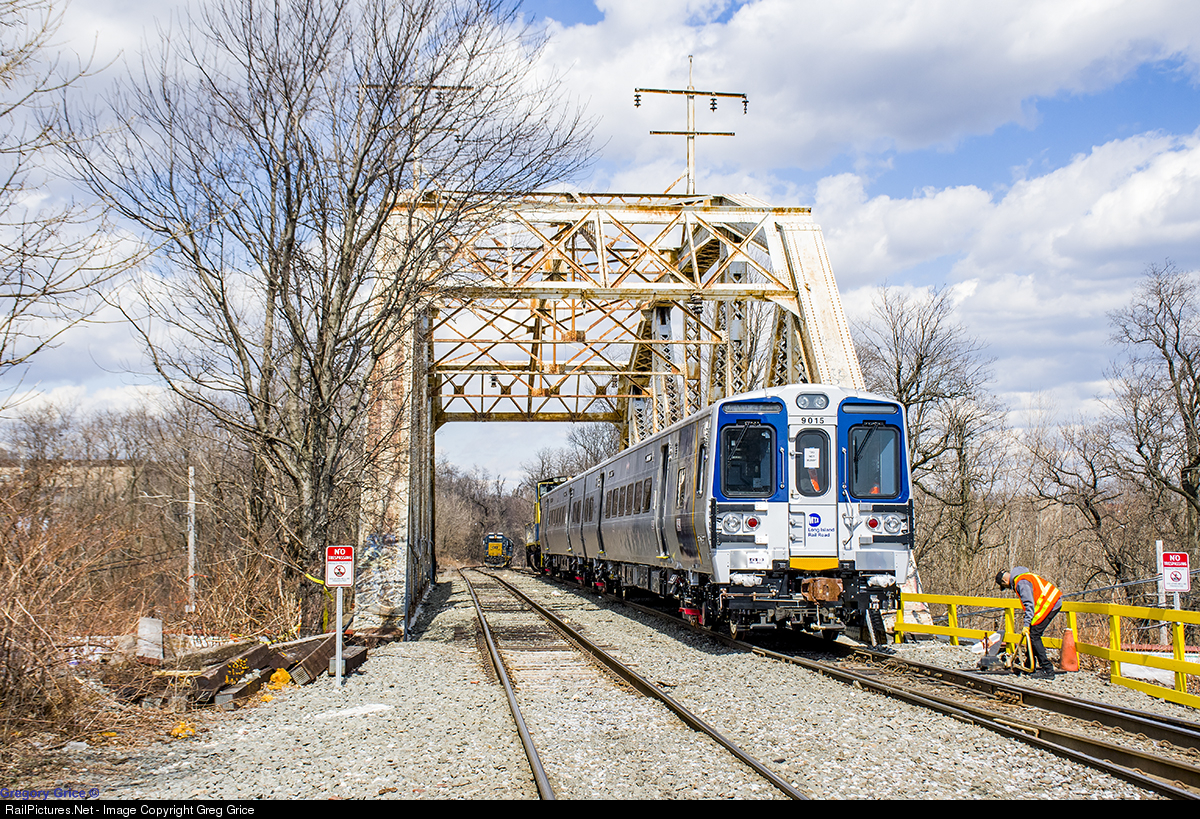 Long Island Rail Road's Roustabout crew tows a pair of Kawasaki M9 EMUs over the Fresh Pond Bridge clear of the "Interchange" switch in order to get downstairs to the Fresh Pond Yard Wye. This pair, numbered 9015 & 9016, are the first "production" cars produced from Kawasaki's Lincoln Nebraska Plant. Once the pair is downstairs, Kawasaki officials inspect the cars for any damage that may have occurred in transit. |