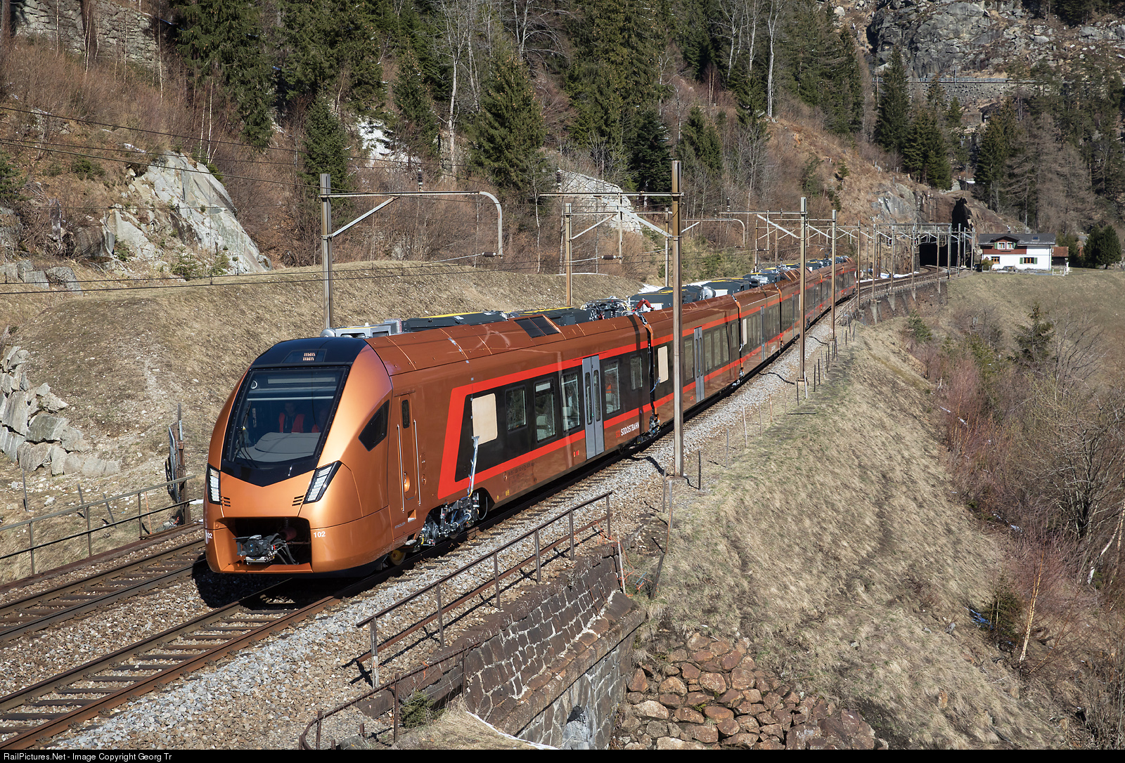 | StadlerRail "Flirt 3" "Traverso" RABe 526 102/202 of the Südostbahn (SOB) on a test run on the Gotthard mountain line above Wassen towards Göschenen. From December 2020, these trains will travel between Zurich/Basel and Locarno via the Gotthard mountain route in cooperation between the Südostbahn and the SBB. |