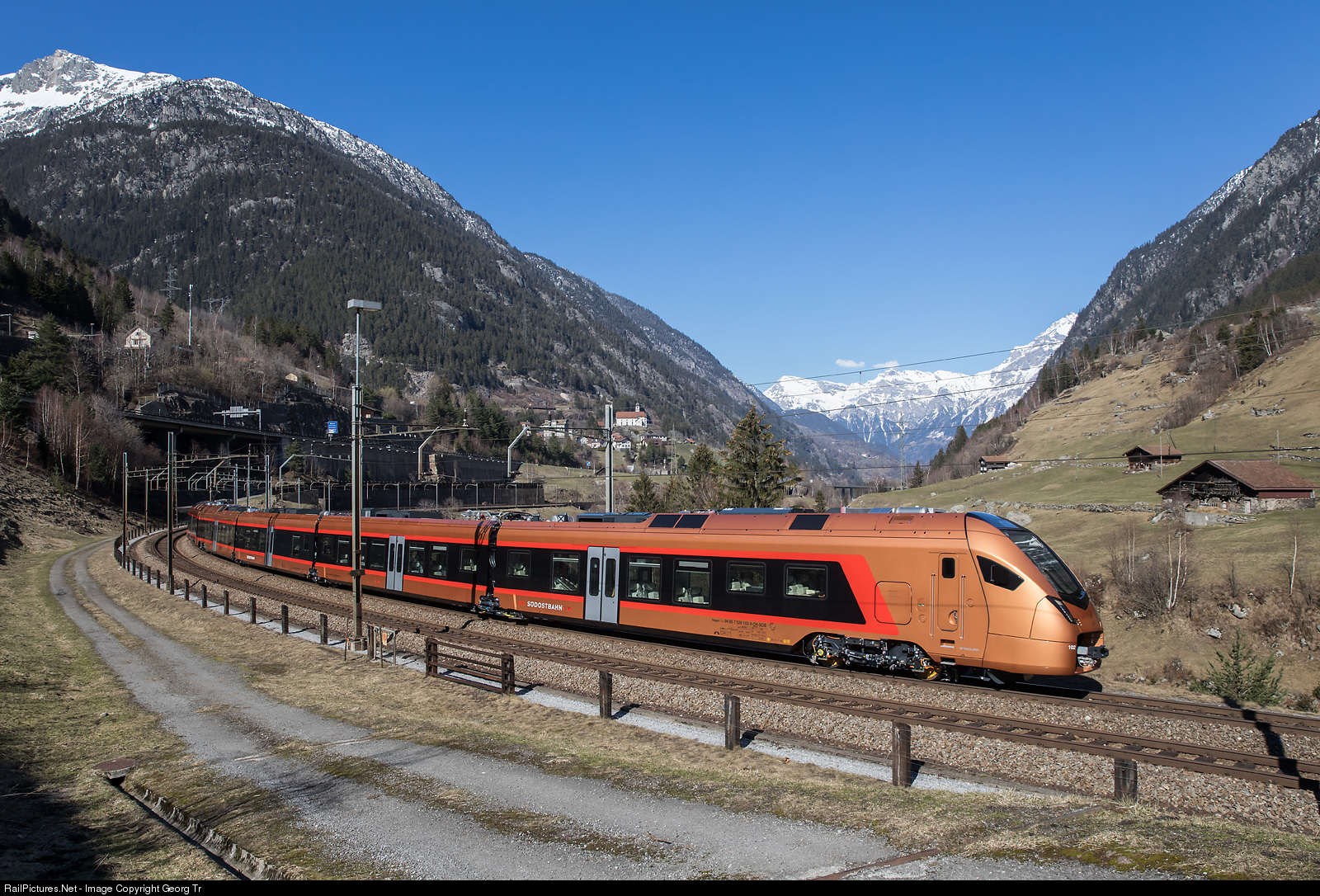 | StadlerRail "Flirt 3" "Traverso" RABe 526 102/202 of the Südostbahn (SOB) on a test run on the Gotthard mountain line in the Wattinger curve near Wassen. From December 2020, these trains will travel between Zurich/Basel and Locarno via the Gotthard mountain route in cooperation between the Südostbahn and the SBB. |