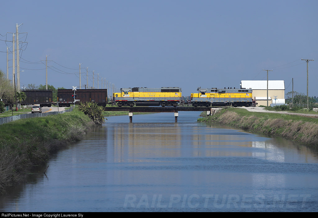304 passes South Bay whilst hauling a rake if empty sugarcane cars from Clewiston to Bryant. 503 is being hauled dead inside the consist. At Bryant 304 will spend several days working the fields, 503 will return with the loaded cars