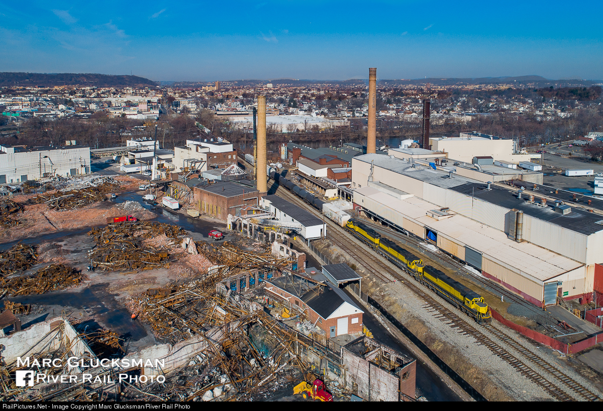 An unfortunately open view. After a series of devastating fires at the Marcal factory in Elmwood Park, NJ on January 29-30, 2019, the iconic sign no longer shines in the night and many structures have been destroyed. As a late running New York, Susquehanna, and Western Railway SU-100 rolls through on the morning of March 20, 2019, the extensive damage is evident. A matched set of SD60s (3808, 3804, & 3810) have almost arrived at their final destination in Ridgefield Park, NJ.