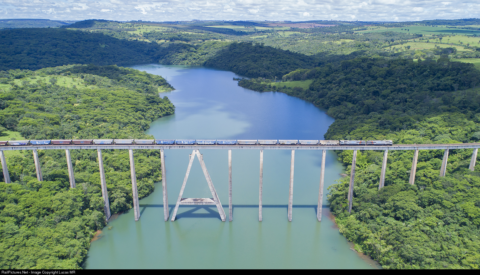 Southbound loaded grain train J098 crossing the "A" viaduct, between Uberlândia and Araguari.