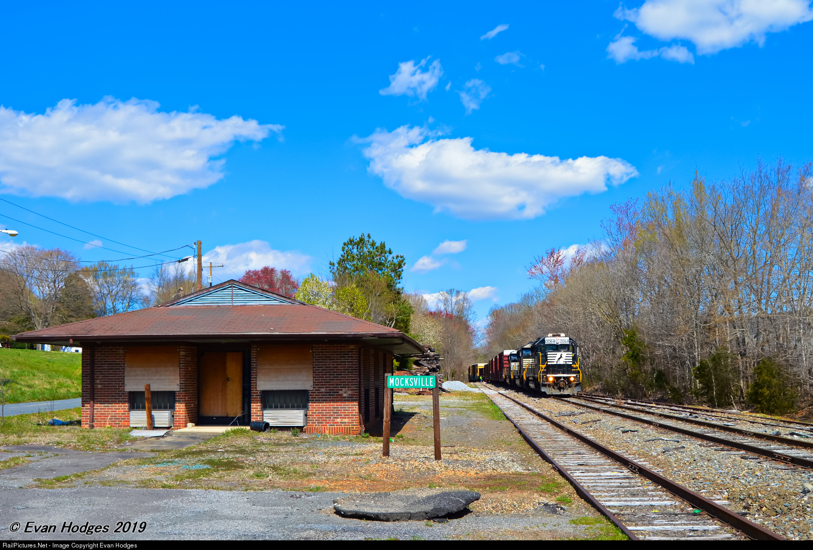 | An ex Conrail locomotive leads a trio of EMD's out of the Mocksville pass track past the old Norfolk Southern Depot with a long consist of empty rail cars for Barber Junction, NC. |