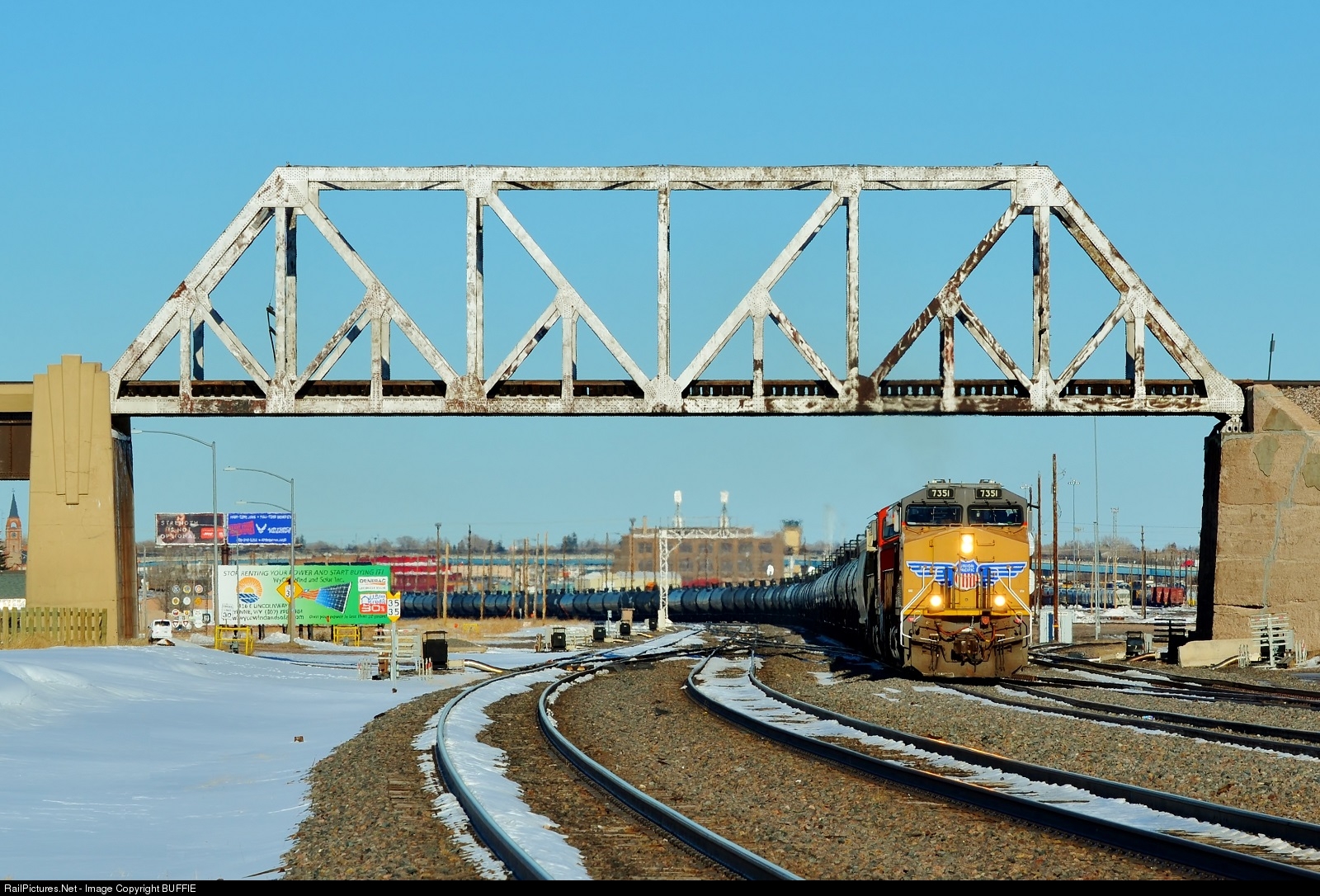 | UP 7351 (AC45CCTE) pulls an oil can train out of the UP Cheyenne Yard, passing under the BNSF (former C&S) bridge. |