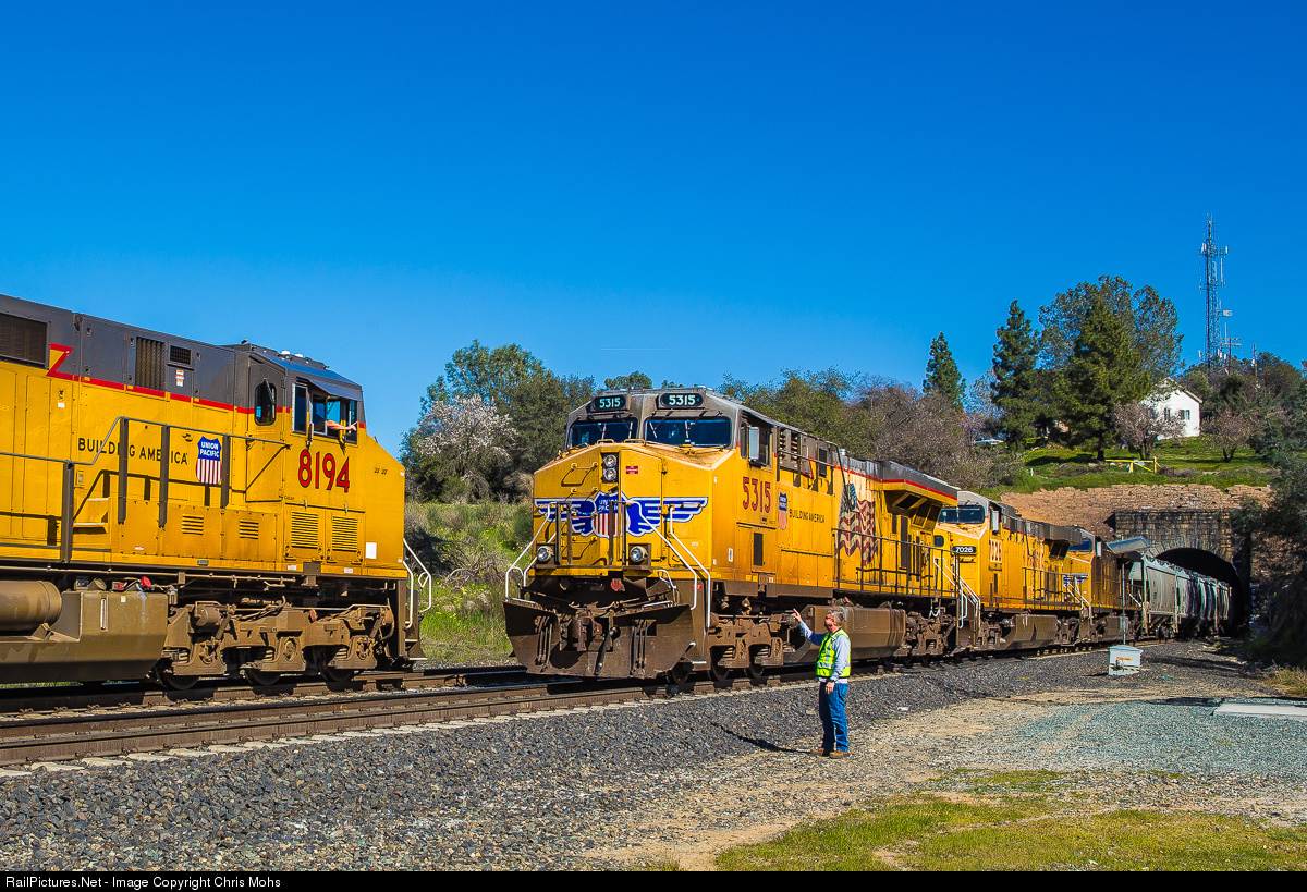 On the Roseville Sub, the conductor of westbound UP no. 5315 is on the ground waving a greeting to the crew of eastbound UP No. 8194, as he watches the Roll by.