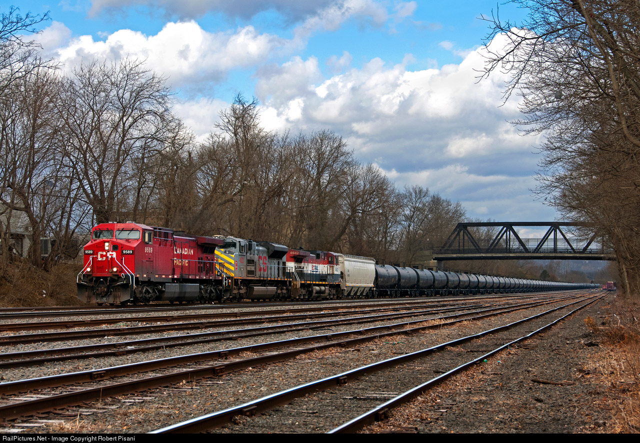 | Loaded CSX ethanol train K266 is led by a very unusual consist. CP 9589 leads KCS (gray) SD70ACe 4023 and BC Rail C44-9WL 4642. The train is passing Manville Yard shortly after entering the Trenton Sub at CP Port Reading Jct. |