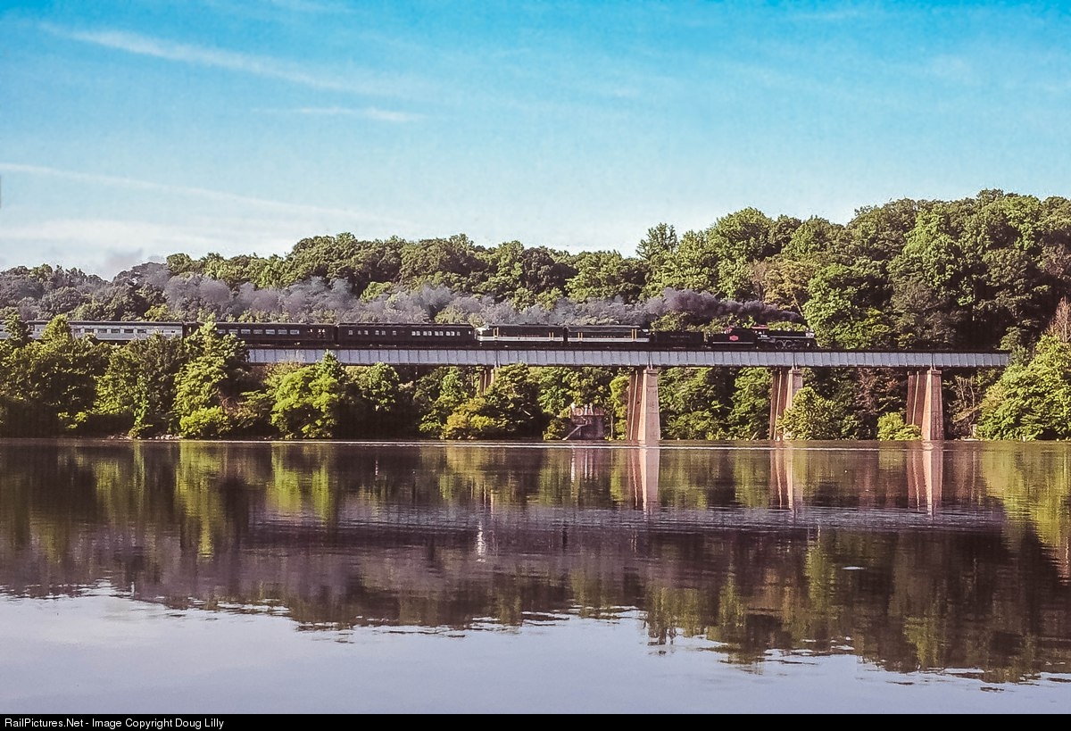 Savannah & Atlanta 4-6-2 750 leads a Alexandria – Front Royal Southern Railway excursion across the trestle over the Accotink creek, as viewed across Lake Accotink in Springfield, Virginia. The long excursion train was a bit heavy for the diminutive Atlantic, so two FP7’s are assisting.