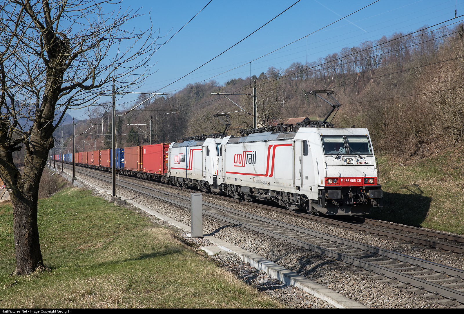 | Bombardier TRAXX F140 MS locomotives 186 # 905 and # 902 of TXLogistik are pulling southbound container train 43003 from Rheinhausen/Germany to Pomezia San Palombo/Italy on the Bözberg south ramp between Schinznach Dorf and Brugg (AG), near Umiken. |