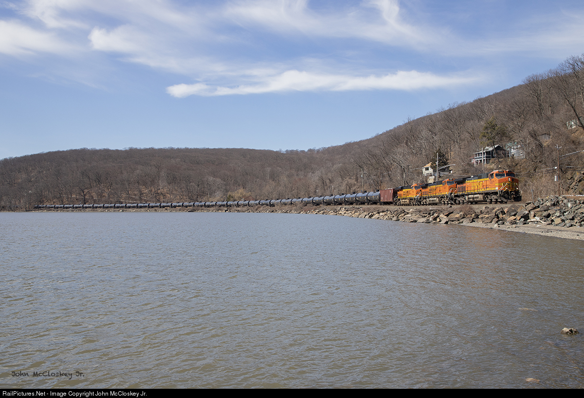 Empty oil train K13923 is seen rolling north along the Hudson River in Stony Point, at CP-38 on the River Subdivision, with a trio of BNSF GEs for power.