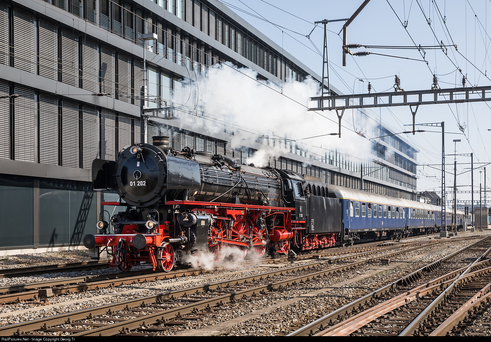 The 4-6-2 "Pacific" 01 # 202 is running through Solothurn with the "Blue Train" of the german IGE, on the way from Zürich Altstetten via Wettingen-Mellingen-Lenzburg-Aarau-Olten-Oensingen to Biel-Sonceboz-Tavannes-Delémont-Laufen-Basel.