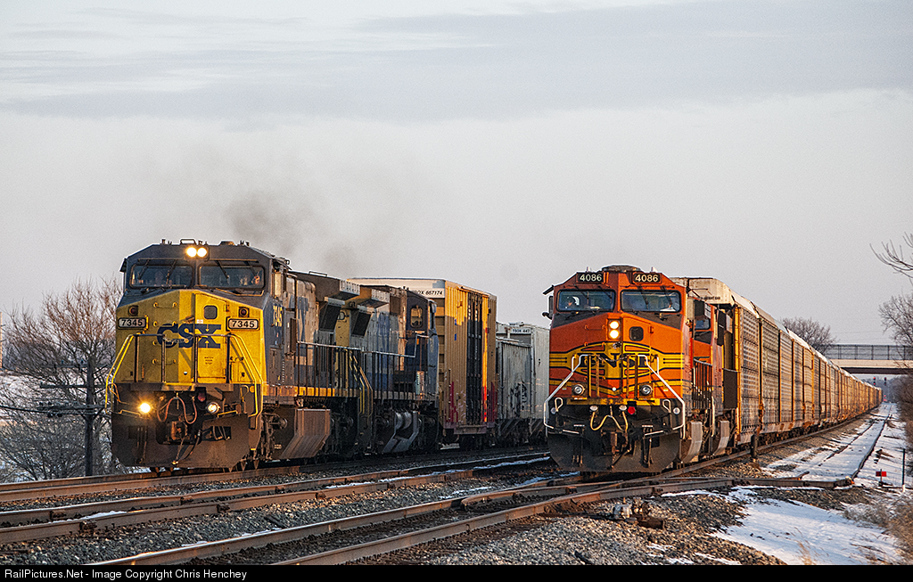 | All the way back 4 years ago now, CSX manifest Q634 heads north out of Marion, passing the stopped autorack train X206 with BNSF power in charge. |