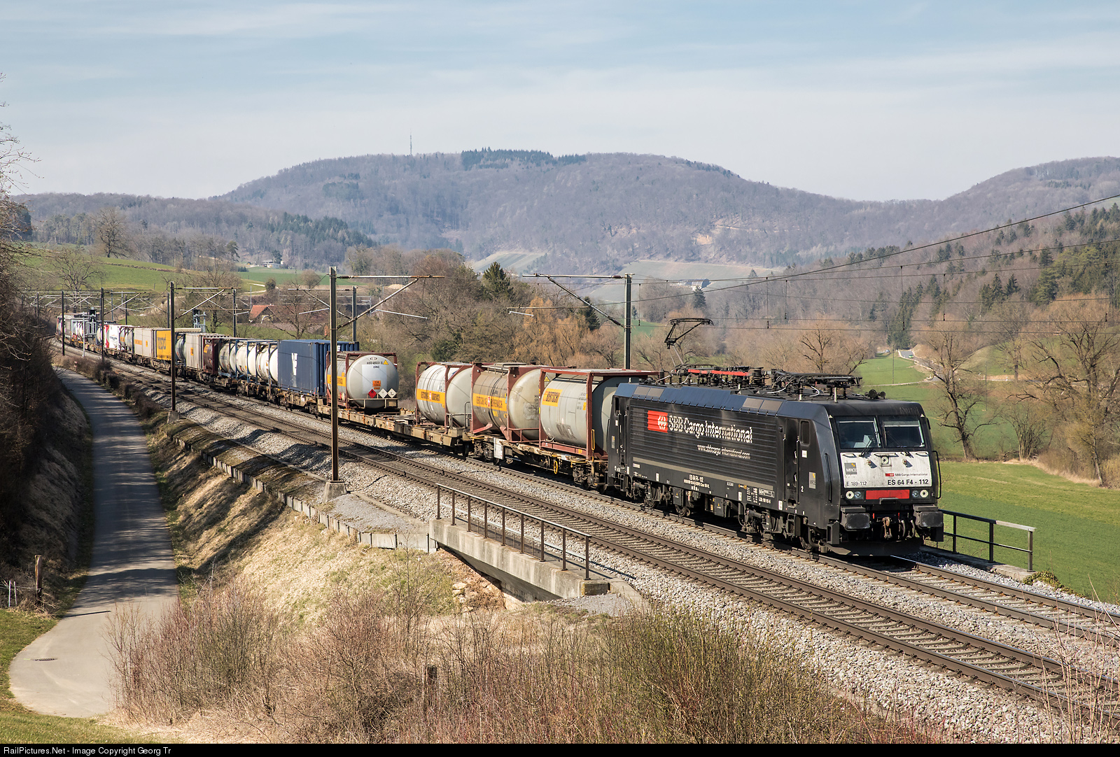| Siemens Eurosprinter ES 64 F4 # 112 (or E 189 # 112) of Mitsui Rail Capital Europe (MRCE) Dispolok, rented by SBB Cargo International, is pulling the southbound HUPAC intermodal train 40245 from Antwerpen-D. S. Oorderen/Belgium to Gallarate/Italy (Busto Arsizio Terminal), on the Bözberg north ramp between Hornussen and Effingen, near Zeihen. |