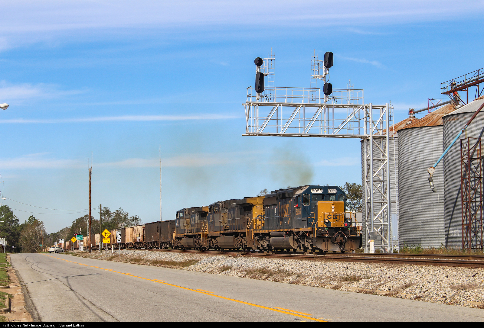 CSX SD40-2 8055, built for the Seaboard Coast Line in August of 1979, roars upgrade at near track speed lugging two AC4400CWs and 14,000 tons of train up the long grade into Rebecca, GA on the CSX Fitzgerald Subdivison. It has been roughly six months since the old ACL searchlights have fallen at this location, and now a large signal cantilever dominates the scene.