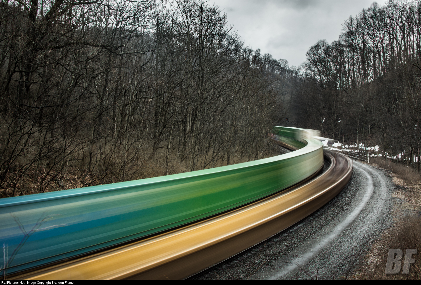 | Two Norfolk Southern intermodal trains meet and wind through the S Curve near Birmingham, PA in this 3 second exposure. The PRR position light signals at PT 218 can be seen in the distance. The signals are slated to be removed on April 14, 2019. |