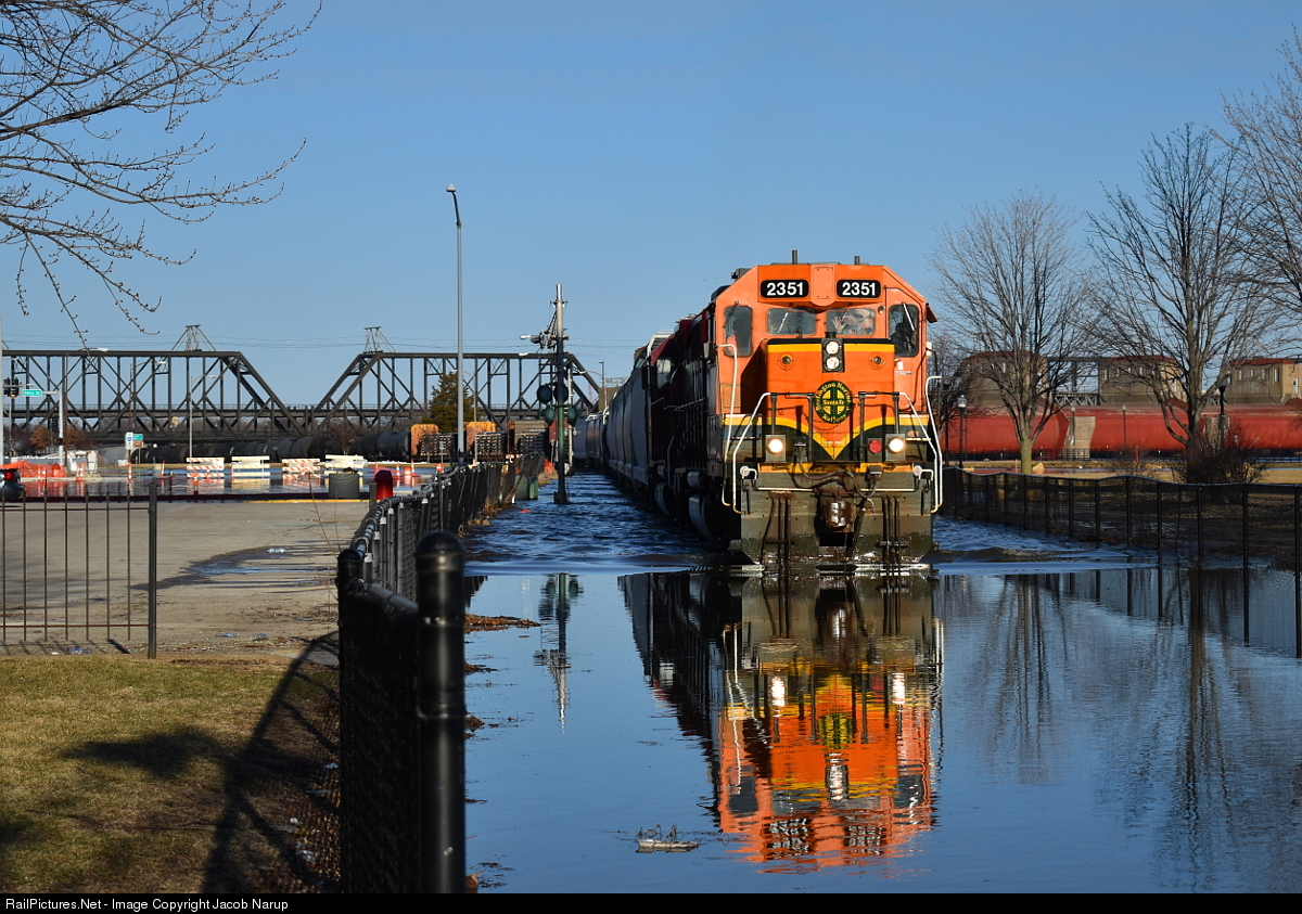 BNSF 2351 leads BN Clinton through the Davenport floodwaters