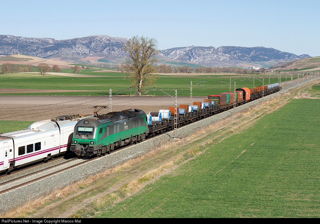| Steel freight Santurce-Aranda de Duero crossing with the Alvia Galicia-Barcelona. Interestingly, for more than an hour I had not seen a single train, but these two agreed to coincide |