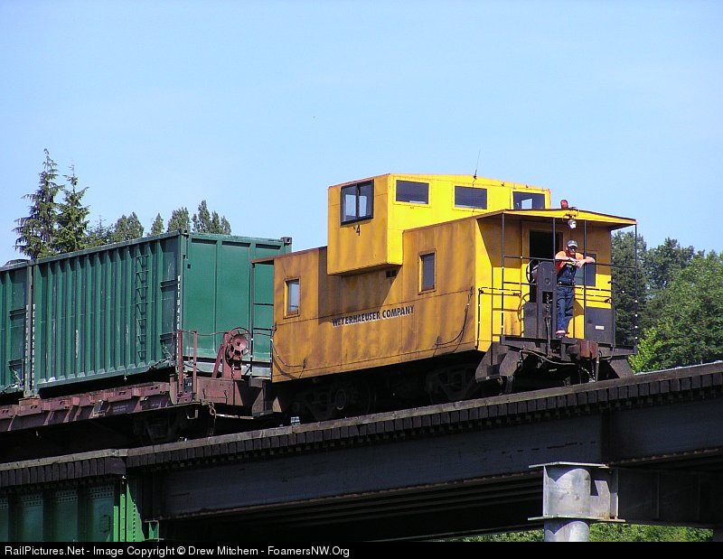 The Brakeman hangs out on the platform of caboose # 4 for Weyerhauser as they cross the Cowlitz River Bridge