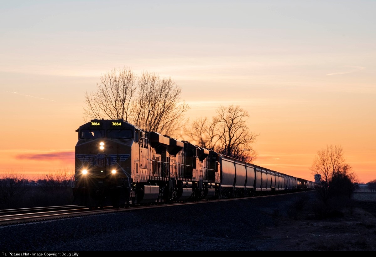 | Eastbound grain roars toward Maple Park, Illinois shortly after the sun has disappeared below the horizon. |