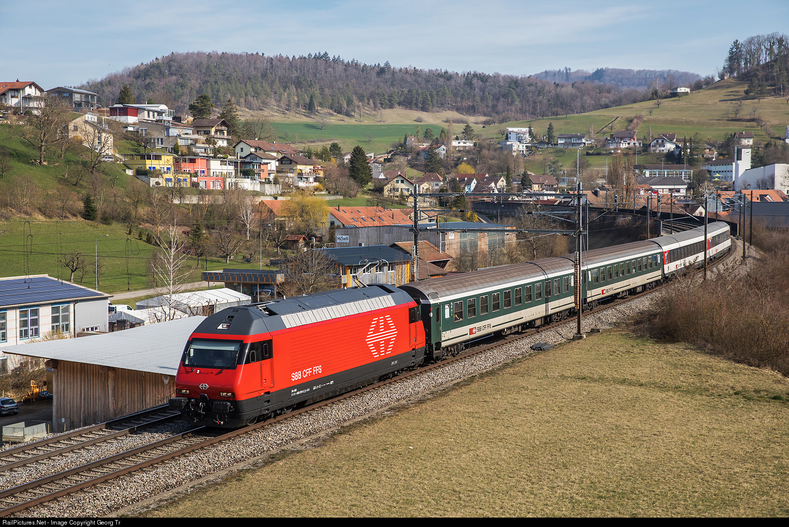 | The Re 460 # 070 looks like brand new, it left the Yverdon SBB works only a few days ago after the large half life-time revision. The locomotive is pulling the Interregio 1974 of the line IR36 from Zürich to Basel on the Bözberg north ramp between Effingen and Hornussen, near Zeihen. |