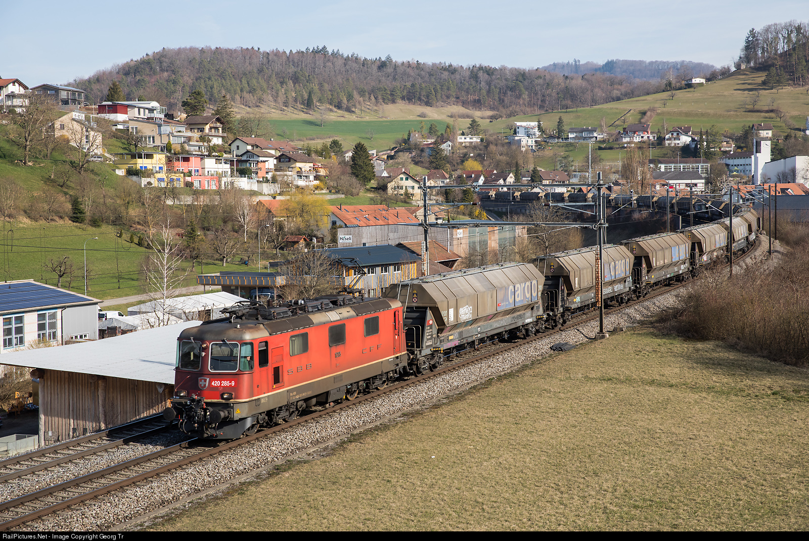 | Re 420 # 285 (Re 4/4 II # 11285), fitted with an automatic coupling (folded up) is pulling a train with empty grain cars from Zürich Herdern to Basel on the Bözberg north ramp between Effingen and Hornussen, near Zeihen. |
