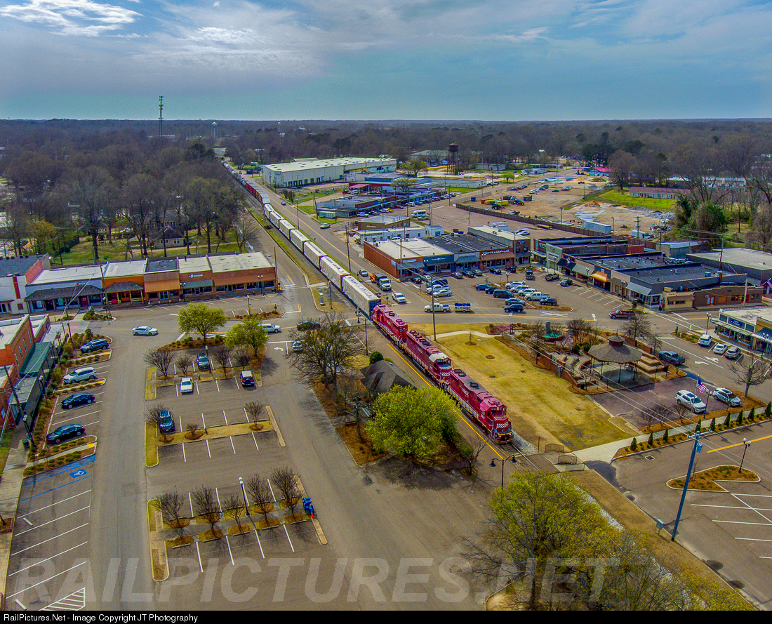 After meeting a southbound manifest at Batesville, Mississippi, HLCX 3832 departs north through the Batesville Square with a manifest bound for Memphis.