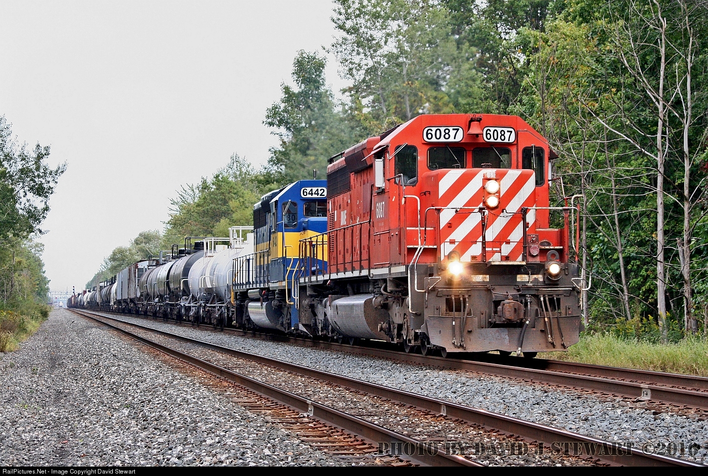 GMD built SD40, DM&E 6087 sports what gives the unit an odd look in the fact that the air reservoirs aren't in their normal location but rather mounted within the carbody although not many notice this fact, meanwhile 6087 leads a westbound at Ashtabula, Ohio on September 22, 2010.