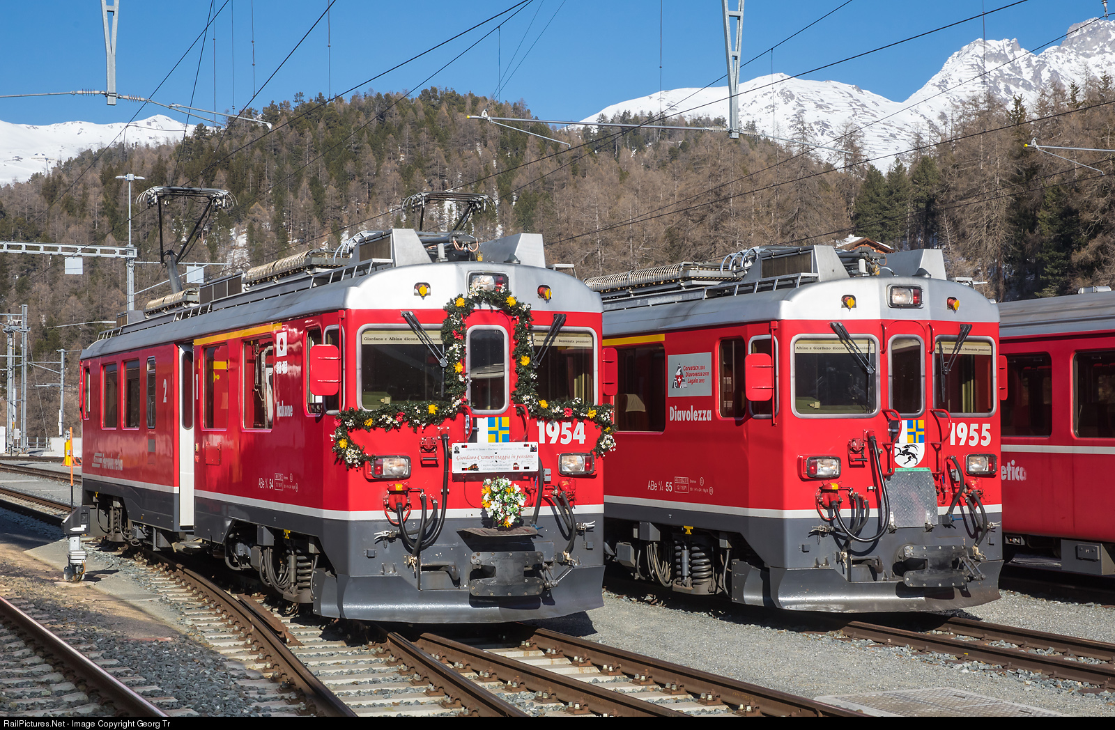 | Railcars ABe 4/4 # 54 "Hakone" (decorated with flowers) and # 55 "Diavolezza" of the RhB, which were renumbered to # 1954 and # 1955 due to this festive occasion. These are the birth years of the locomotive driver Giordano Crameri and the conductor (chief of train) Albino Bontognali, who made together their last journey before retirement with train 4656 from Tirano to St.Moritz, pulled by this two railcars in multiple traction.