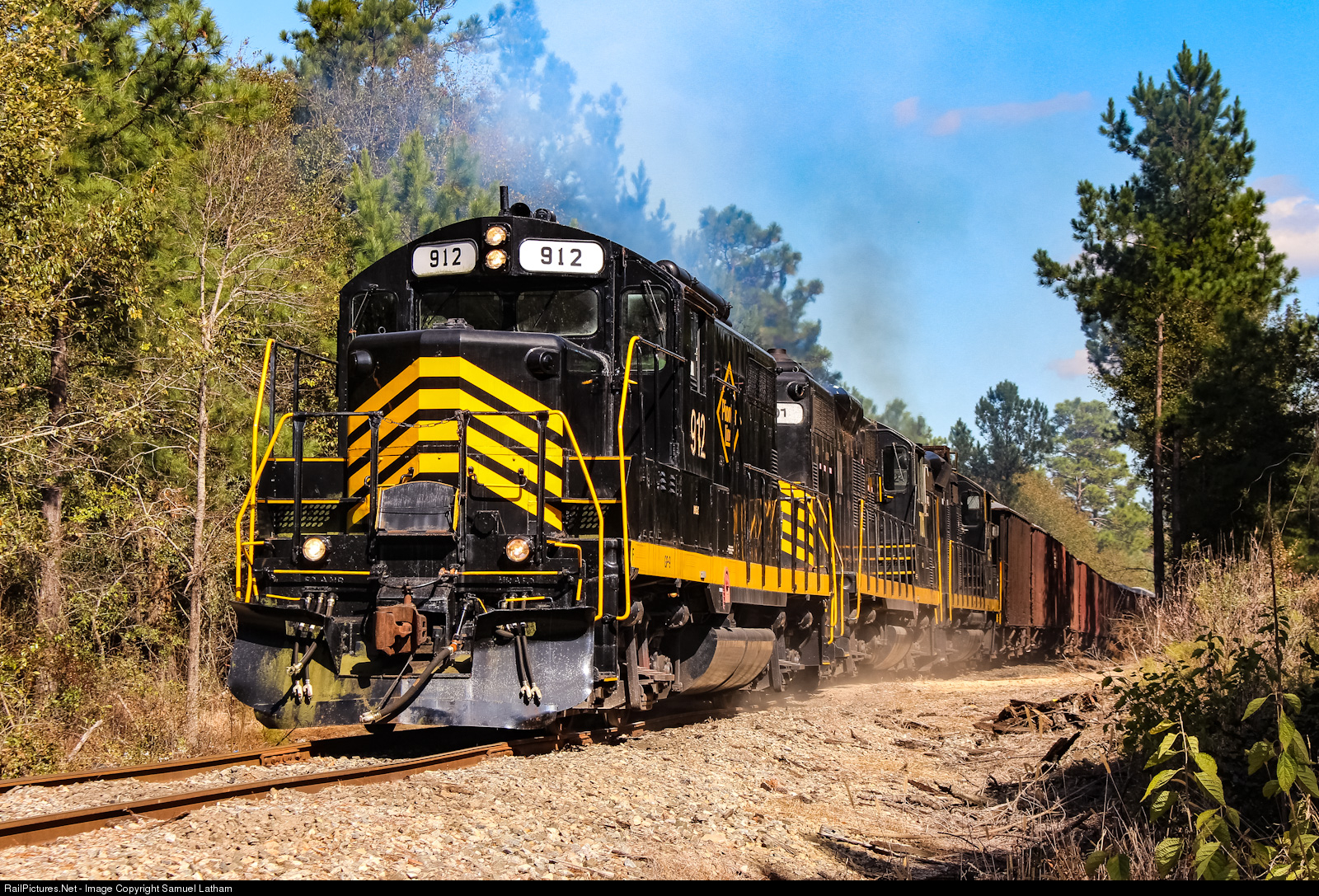 Pioneer Railway GP9 912, built new for the Chicago Northwestern in September of 1957 as their 1742, grinds upgrade with a GP7 and GP20 assisting 43 cars up the hill near Clito Road north of Statesboro, GA. This was the first time three engines has ever been used on the Georgia Southern. All those cars are good signs, as they are all for online customers!