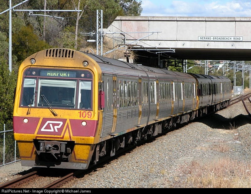100 Series Interurban Multiple Unit 109/105 passes under Nerang-Broadbeach Road slows for a station stop at Nerang on the Gold Coast Line with an afternoon service to Brisbane