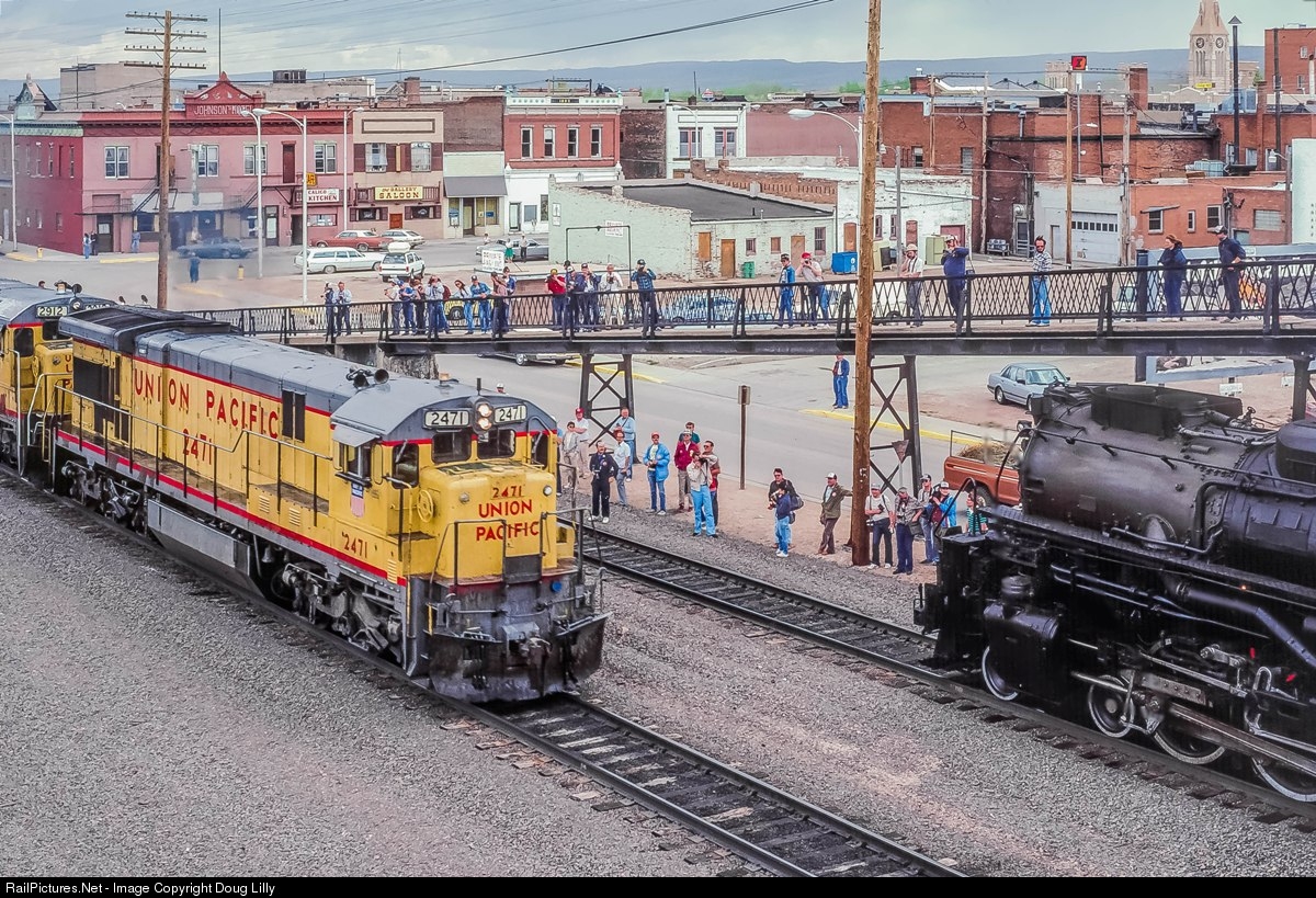An eastbound Union Pacific train rolls past Challenger 3985 shortly after the excursion passengers have detrained at Laramie, Wyoming. Many of those passengers, including the photographer, are stretched along the footbridge over the yard.