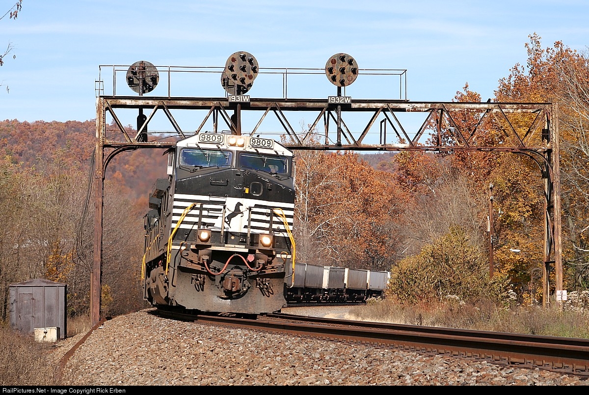 The high speed super-elevated curve through Mapleton, PA was always a great spot to watch traffic with the classic PRR-era signal bridge spanning the right of way. Alas, the signal bridge and position light signals are now gone. NS 9809 leads an eastbound intermodal train through the curve leading toward Jacks Narrows on an autumn afternoon.