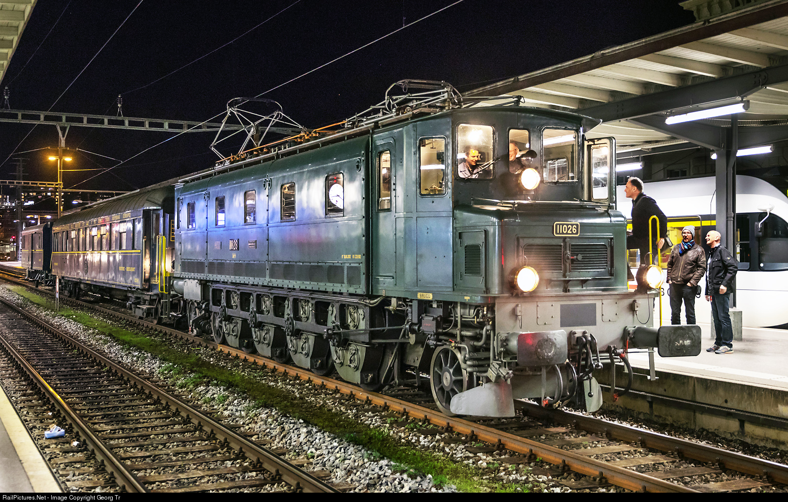 | Former SBB express train locomotive Ae 4/7 # 11026 of association Mikado 1244 with a charter train at Schaffhausen. The locomotive was built in 1934 by SLM and BBC, was withdrawn by the SBB in 1997, came then to Adtranz (successor of BBC) and is running for Mikado 1244 since 2001. Behind the locomotive the former CIWL dining car WR 2749 from 1926, privately owned and operated by steam group Zürich (VDZ). In the rear baggage car D 925, former BLS. |