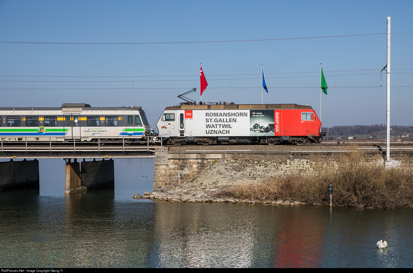 Re 456 # 095 of the Südostbahn (SOB) in publicity paint scheme for "100 years railway line Romanshorn-St.Gallen-Wattwil-Uznach 1910 to 2010" is shoving the Voralpen-Express VAE 2566 from St.Gallen to Lucerne over the lake dam between Rapperswil and Pfäffikon SZ. In front of the push-pull train is Re 456 # 094 "VÖGELE SHOES".