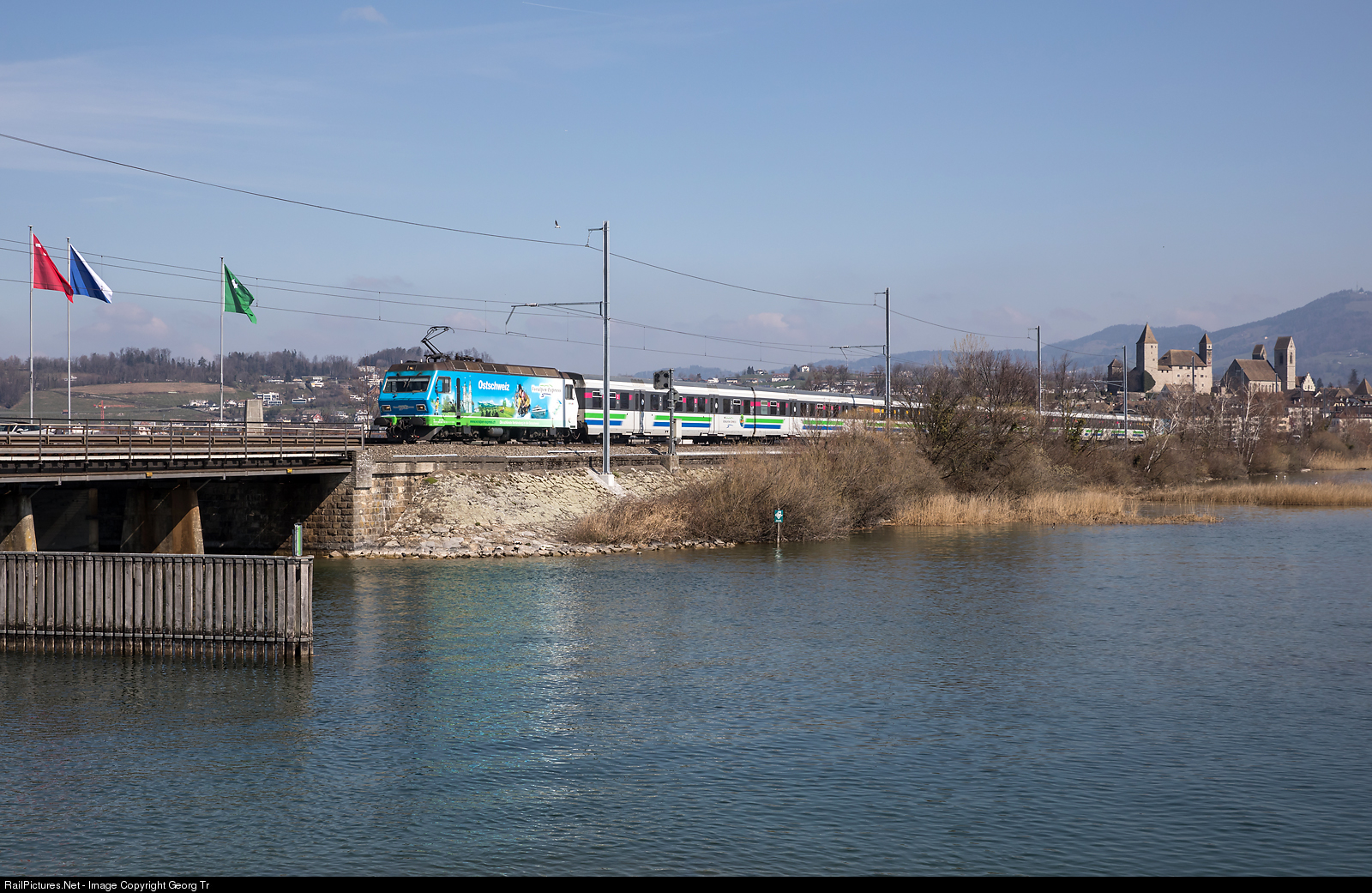 | Re 456 # 096 of the Südostbahn (SOB) in publicity paint scheme for "Voralpen-Express Ostschweiz" is pulling the Voralpen-Express VAE 2570 from St.Gallen to Lucerne over the lake dam between Rapperswil and Pfäffikon SZ. In the rear of the push-pull train is Re 456 # 091 "Voralpen-Express Zentralschweiz". This Voralpen-Express push-pull train will be withdrawn soon, replaced by the new TRAVERSO RABe 526.1 "Flirt 3" trains from StadlerRail. |