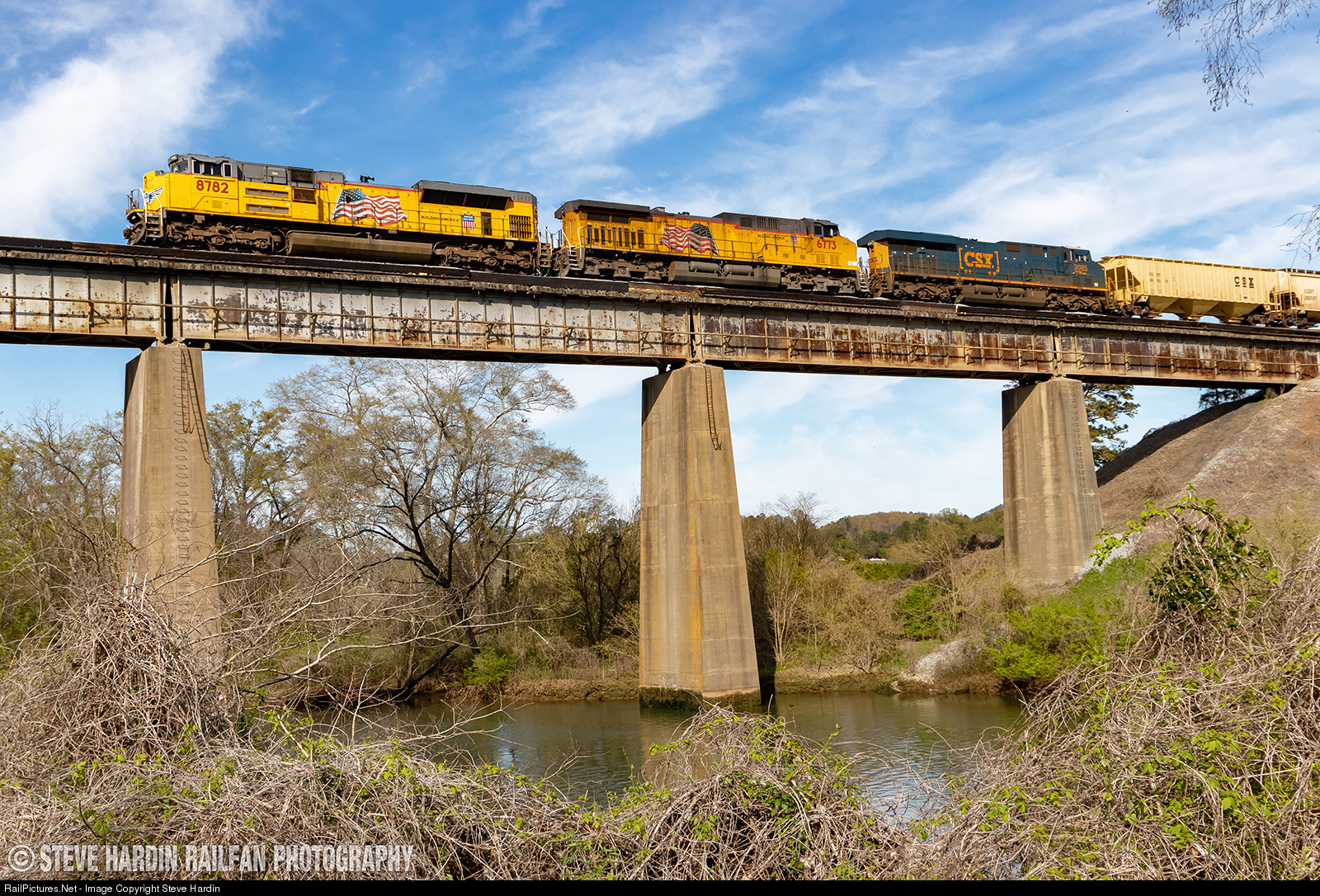 | After waiting nearly 90 minutes for M.O.W. and inspectors to clear the track, the empty grainer finally motors Northbound over the Etowah River, with a nice Union Pacific ACE unit leading the run. |