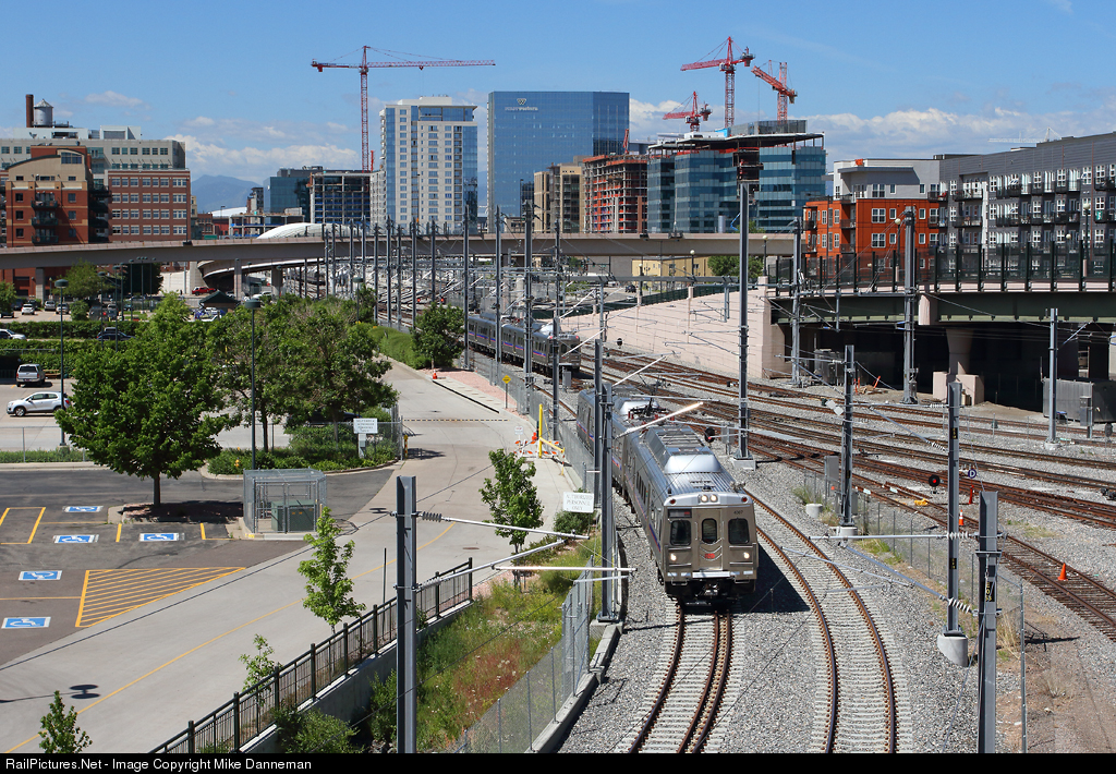A RTD A Line electric commuter train to the airport has just met an inbound train just outside Denver Union Station in a view from the 22nd Street overpass in Denver, Colorado, on June 4, 2016. The constantly growing skyline around DUS is marked with construction cranes in the background.
