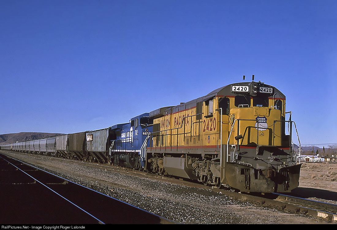 Union Pacific GE C30-7 2420 with Conrail C40-8W 740 at Yermo, California.