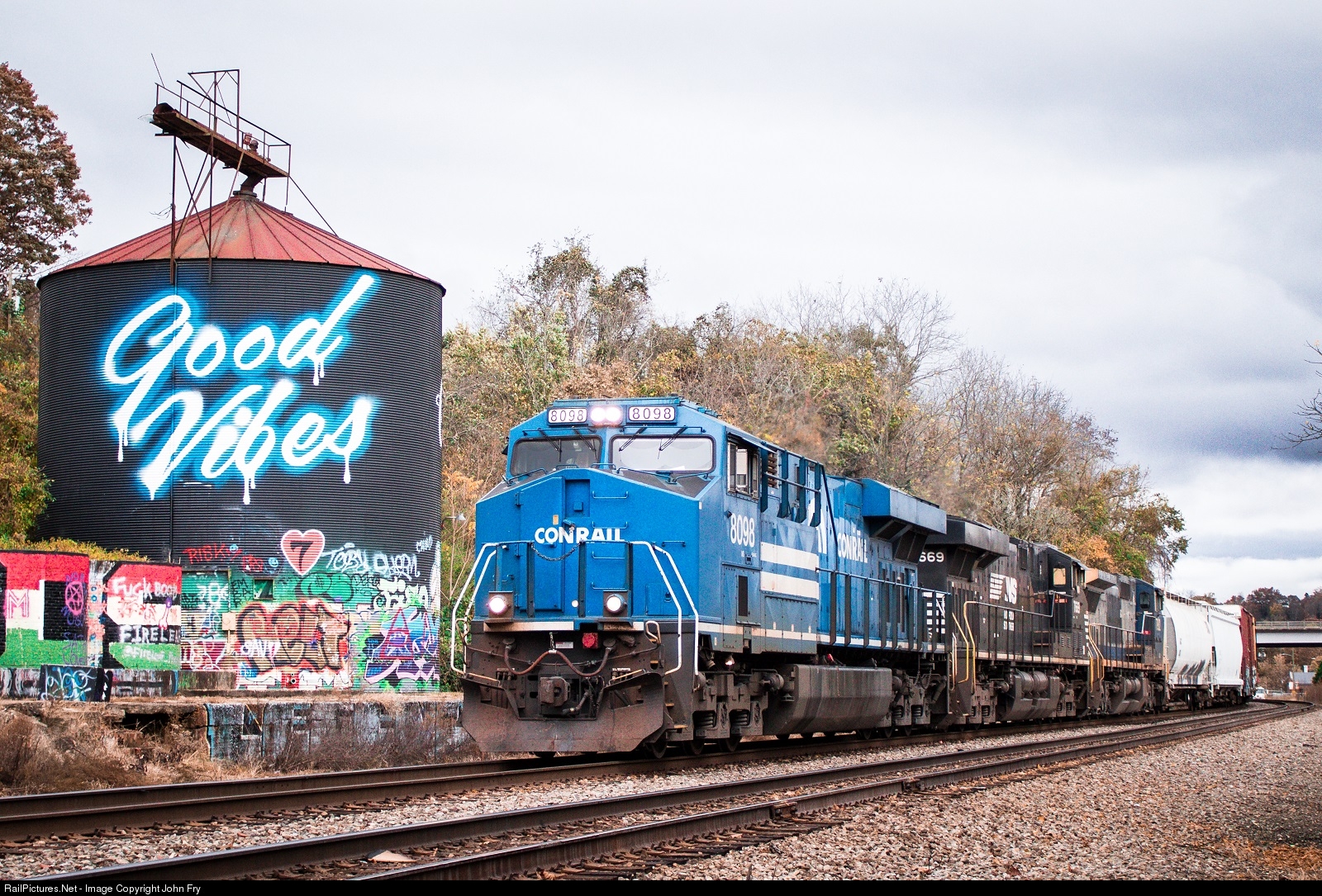 | The Conrail heritage unit compliments the blue paint on the silo and adds some color to a dreary winter day in North Carolina as it leads eastbound manifest train 135 out of town. The silo is a recognized attraction in Asheville and has since been repainted with a new catch phrase. |