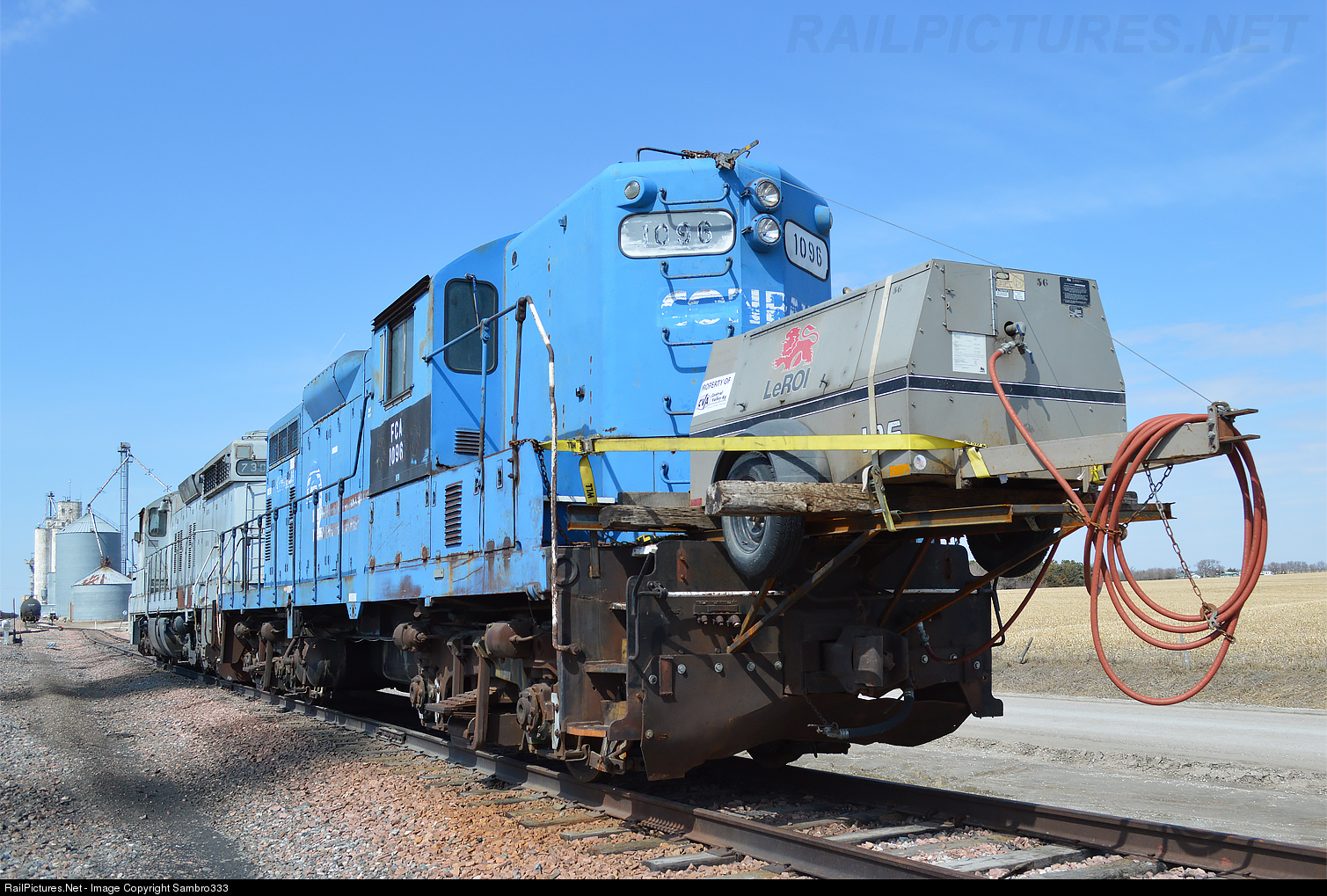 Apparently the Ex-Conrail GP8 at the grain elevator in Tamora, Nebraska needed a little help building air. The folks at the Co-Op strapped an air compressor up on the front pilot.