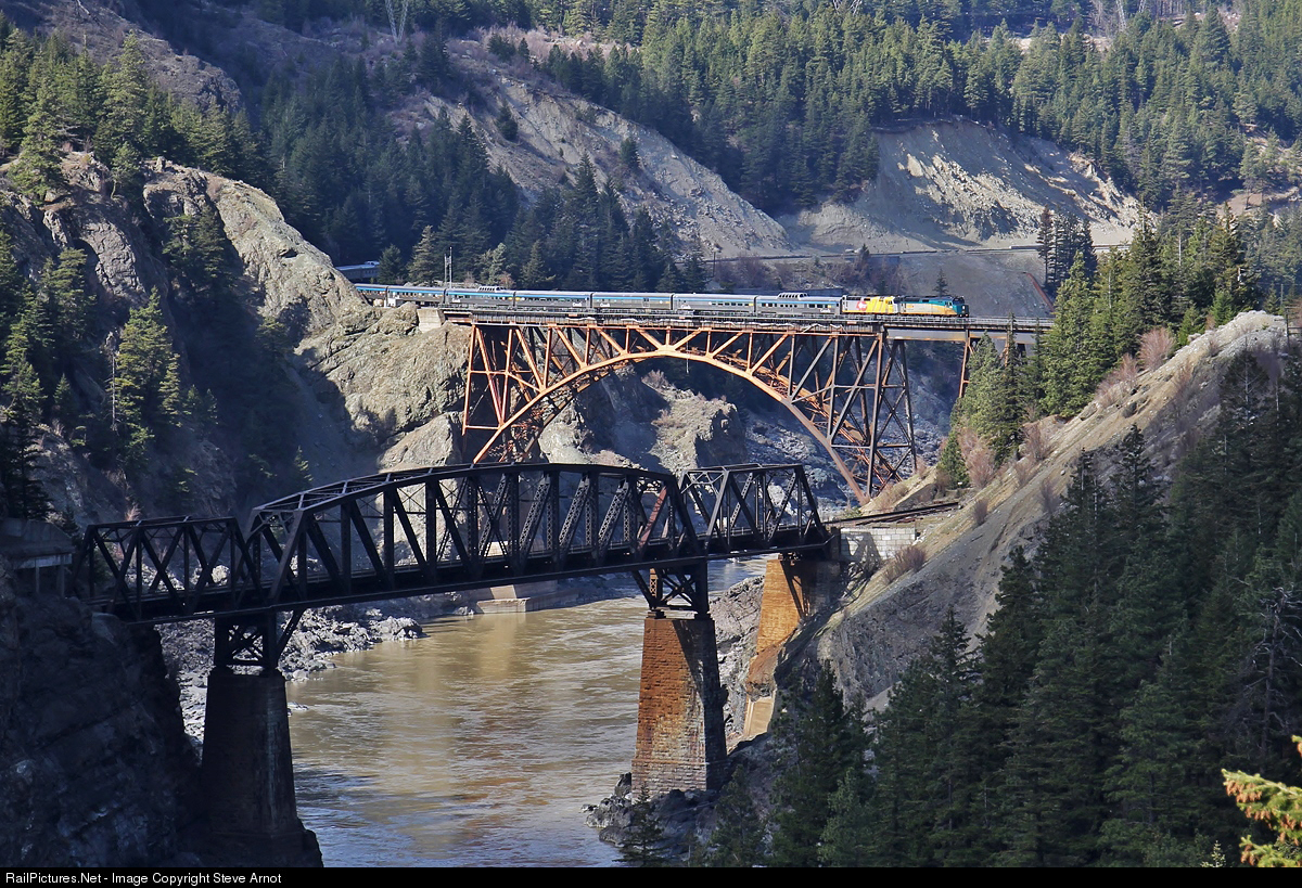 Running approximately five hours behind schedule, VIA F40PH-3s 6406 and 6454 lead the westbound Canadian over CP's Thompson Sub and the Fraser River at Cisco, BC.