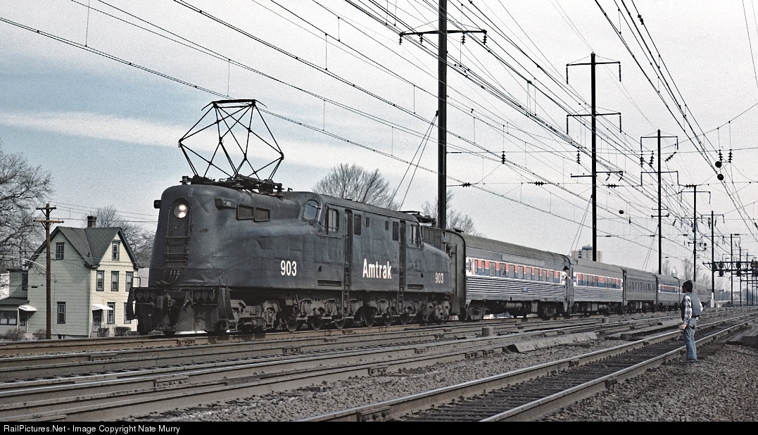 This train is stopped, having just raised its front pantograph after encountering a mechanical issue with the rear one. Two other slides I was not able to acquire show both pans down, and then the front one in the middle of extending. An original Kodachrome slide from my collection; the photographer was not specified.