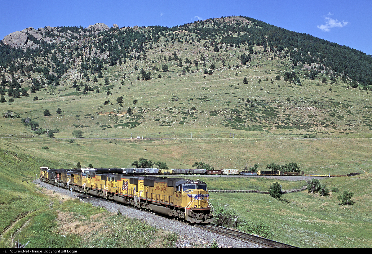 | On July 4, 2005 UP put on a show at Big Ten above Denver as its westbound manifest took on the Front Range with no less than eight locomotives including one still in SP paint. Here it is in the lower loop below Clay siding and is about to round Big Ten curve itself. |