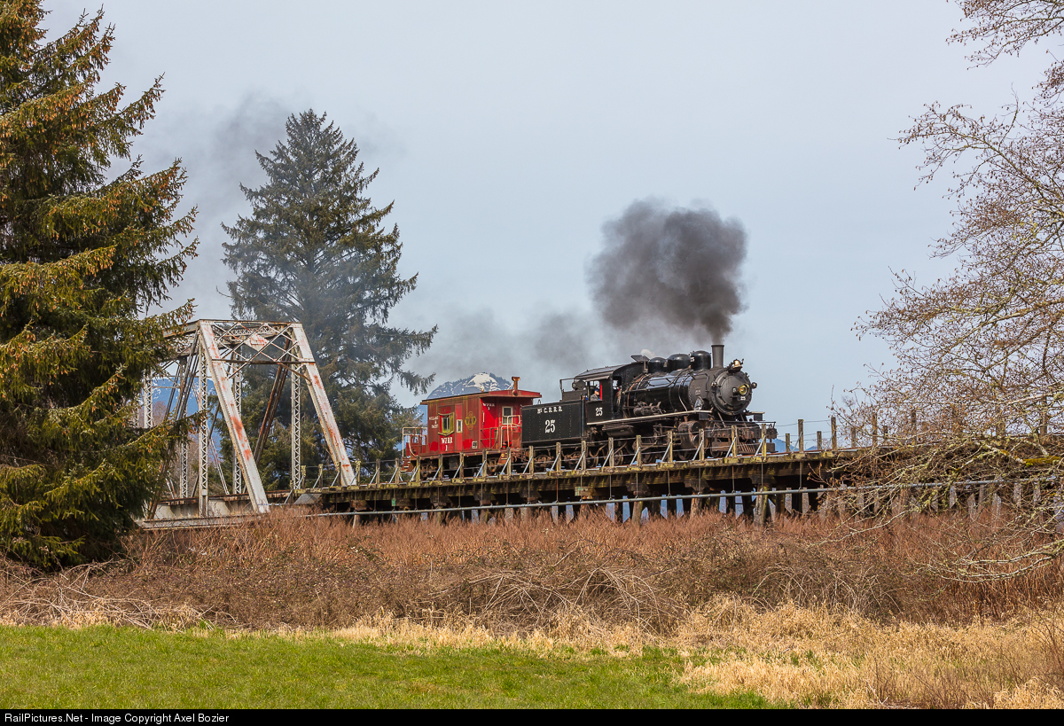 | McCloud River Railroad 2-6-2 Prairie steam locomotive #25 with its Willamette & Pacific caboose just crossed the second Nehalem River Bridge on the Oregon Coast Scenic Railroad south of Mohler, OR. |