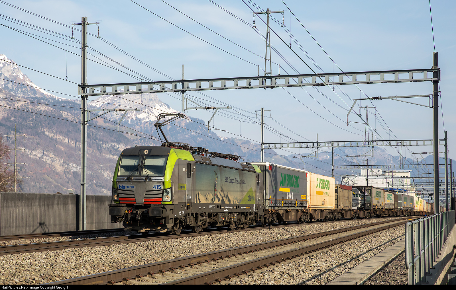 | Siemens "Vectron" Re 475 # 415 of BLS Cargo is pulling the southbound AMBROGIO intermodal train 42091 from Neuss/Germany to Gallarate/Italy (Busto Arsizio Terminal), between Altdorf and Rynächt towards the Gotthard Base Tunnel. |
