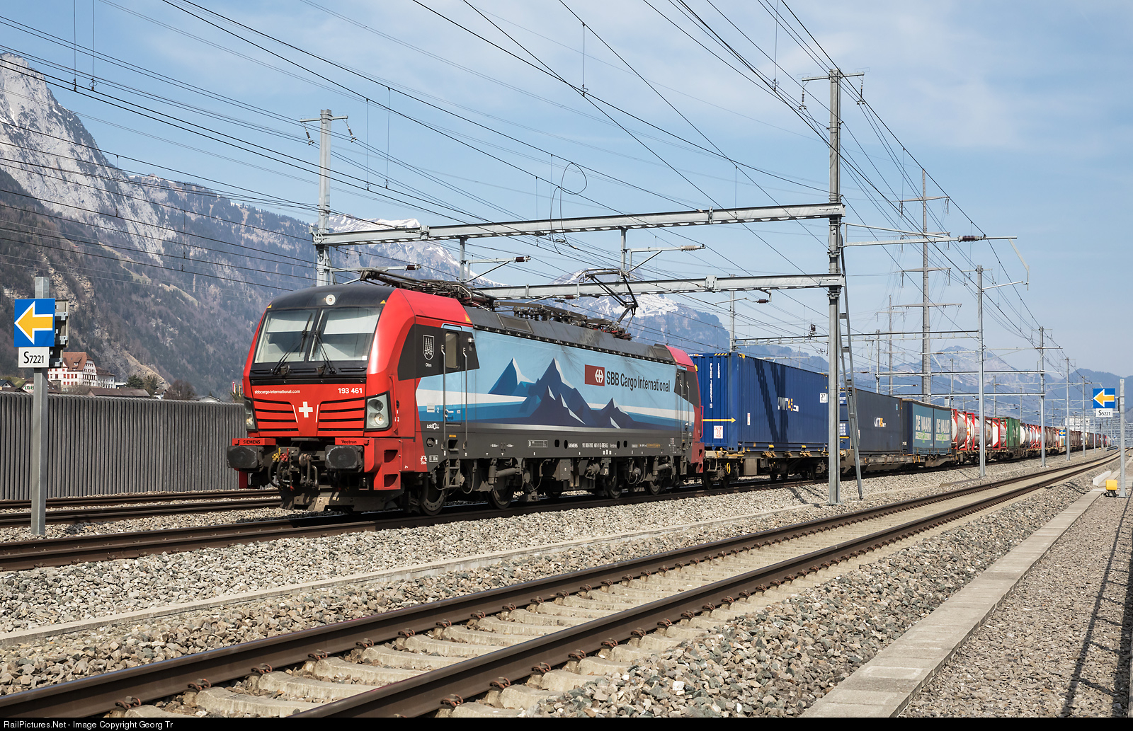 | Siemens "Vectron" 193 # 461 "Olten" of SBB Cargo International, rented from the LokRoll leasing company, is pulling the southbound intermodal train 40137 from Rotterdam Waalhavn/Netherlands to Gallarate/Italy (Busto Arsizio Terminal) towards the Gotthard Base Tunnel between Altdorf and Rynächt. |